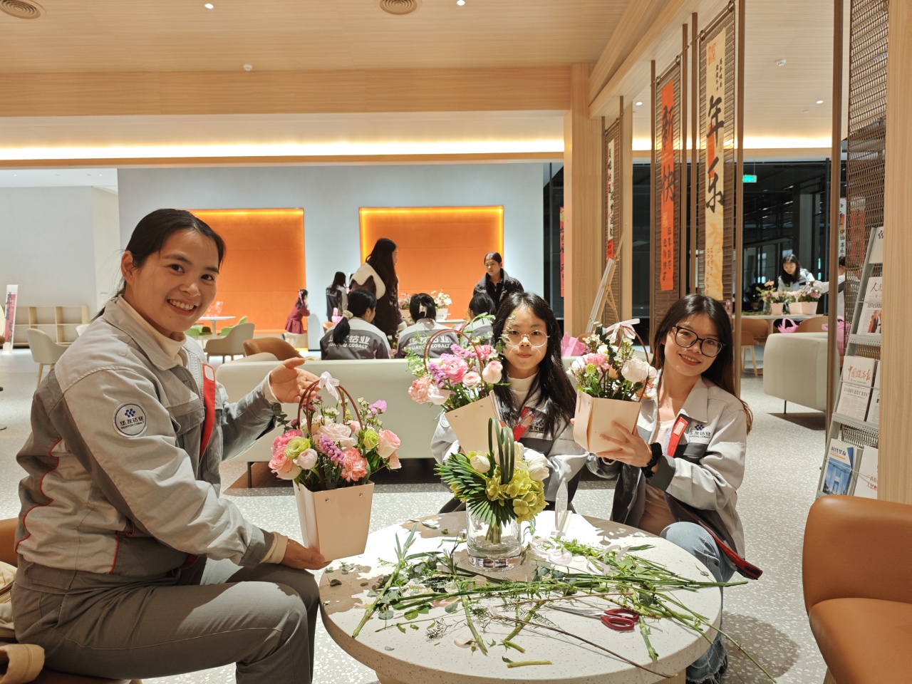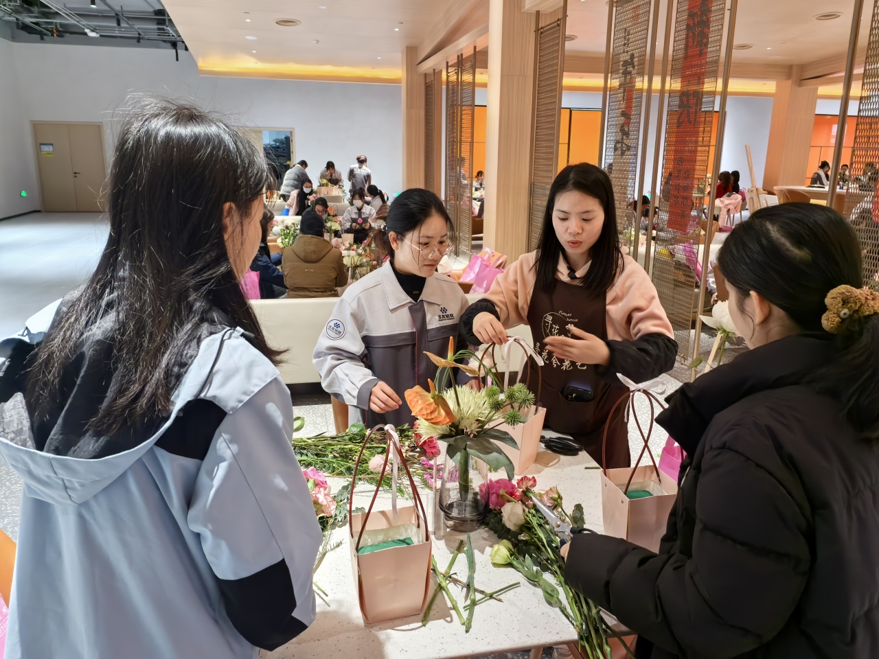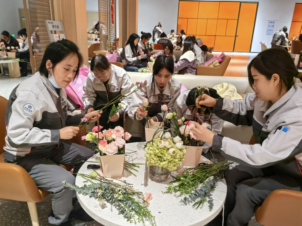 健康講座結(jié)束后,員工們在花藝師指導(dǎo)下進(jìn)行春日主題插花創(chuàng)作。拆開春日花材包的那一刻,商超休閑中心化作花香彌漫的創(chuàng)作空間??的塑暗臏厝帷⒀蠼酃5撵`動、尤加利葉的堅(jiān)韌…… 每一束花籃都是職場女性多重角色的生動寫照。