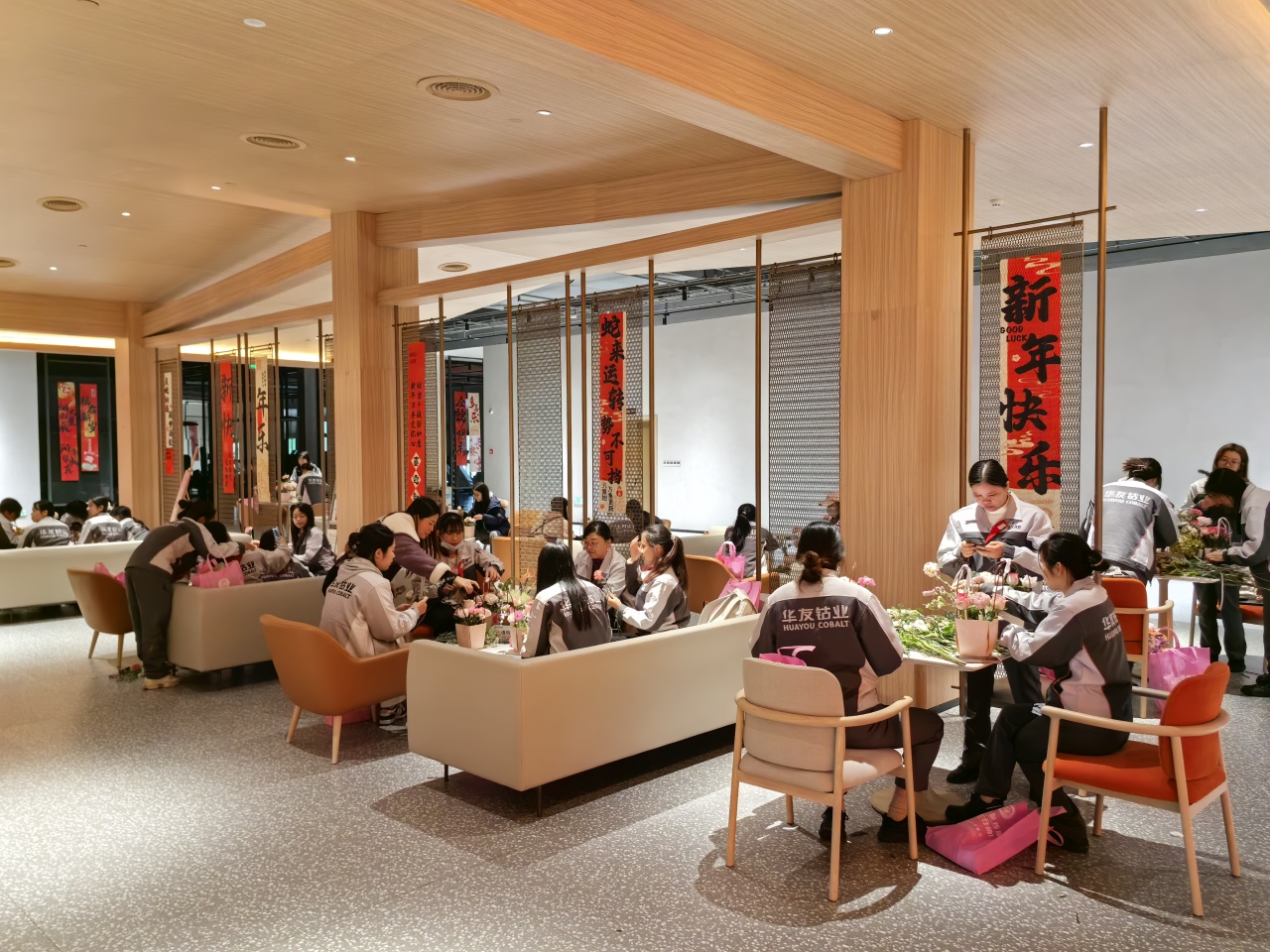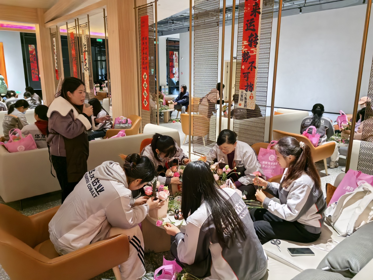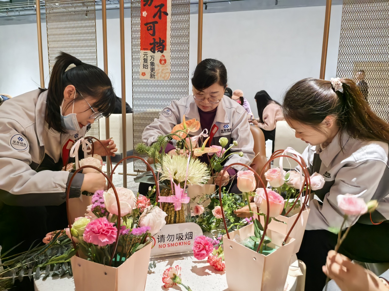 健康講座結(jié)束后,員工們在花藝師指導(dǎo)下進(jìn)行春日主題插花創(chuàng)作。拆開春日花材包的那一刻,商超休閑中心化作花香彌漫的創(chuàng)作空間??的塑暗臏厝帷⒀蠼酃5撵`動、尤加利葉的堅(jiān)韌…… 每一束花籃都是職場女性多重角色的生動寫照。