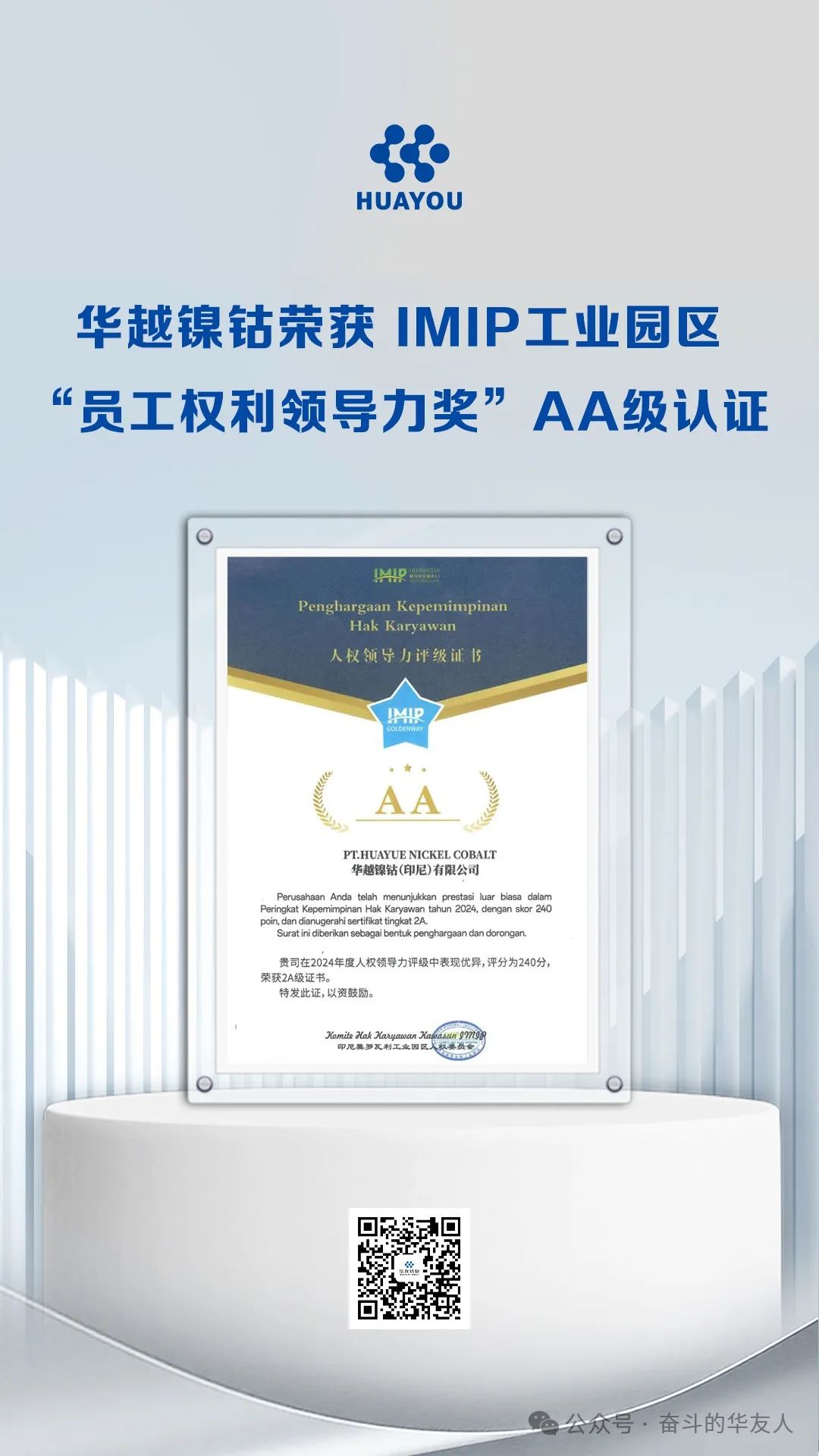 Recently, Huayue Nickel and Cobalt (Indonesia) Co., Ltd. has been awarded the prestigious AA-level certification by the Human Rights Committee of the IMIP Morowali Industrial Park in Indonesia for its outstanding employee management system and human rights practices. With a remarkable score of 240 points in the 2024 Employee Rights Leadership Evaluation, the company solidified its leadership in human resource management and labor rights protection.