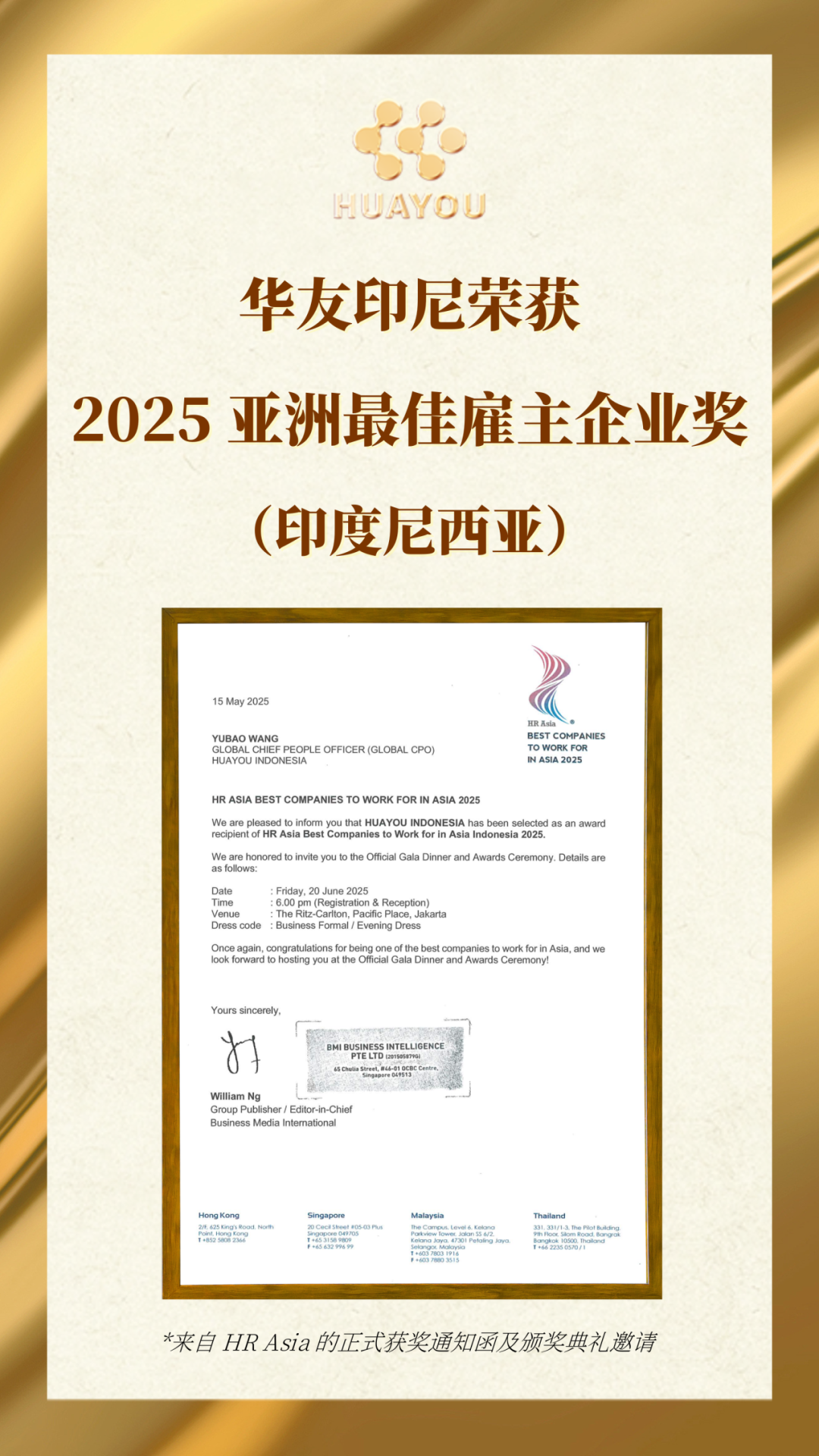 On May 15th, the authoritative HR organization HR Asia announced the results of the "2025 Best Companies to Work for in Asia" award. Huayou achieved the prestigious title of being the best employer brand in Indonesia on its first attempt. This milestone not only highlights the company's long-term commitment to local talent development and corporate social responsibility but also marks a significant achievement in its journey within Indonesia.