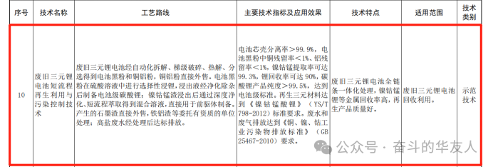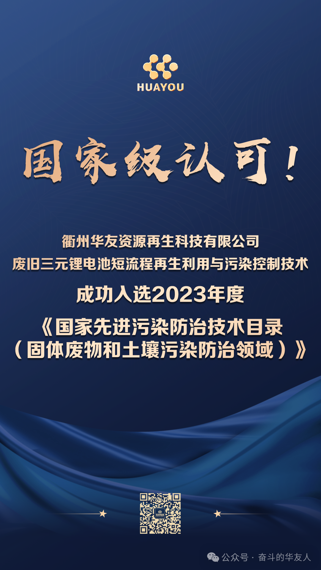 近日,衢州華友資源再生科技有限公司獨(dú)立研發(fā)技術(shù)——廢舊三元鋰電池短流程再生利用與污染控制技術(shù),成功入選“三年一評(píng)選”的2023年度《國家先進(jìn)污染防治技術(shù)目錄(固體廢物和土壤污染防治領(lǐng)域)》(以下簡(jiǎn)稱《目錄》),三元鋰電回收領(lǐng)域全國僅兩家入選國家級(jí)固體廢物污染防治領(lǐng)域示范技術(shù)。