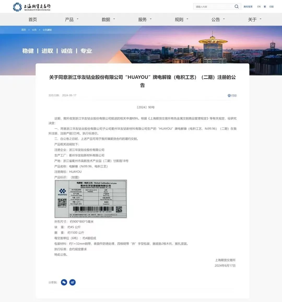 “HUAYOU”牌電解鎳(二期)自2024年1月份起,公司與上海期貨交易所積極溝通,經(jīng)過嚴格的實地考察和抽樣檢驗,最終上海期貨交易所認定華友鈷業(yè)生產(chǎn)的“HUAYOU”牌電解鎳(二期)符合交割品牌的各項要求,允許成為交割品牌,自此印有“HUAYOU”標(biāo)識的電解鎳將再次走進客戶心中。