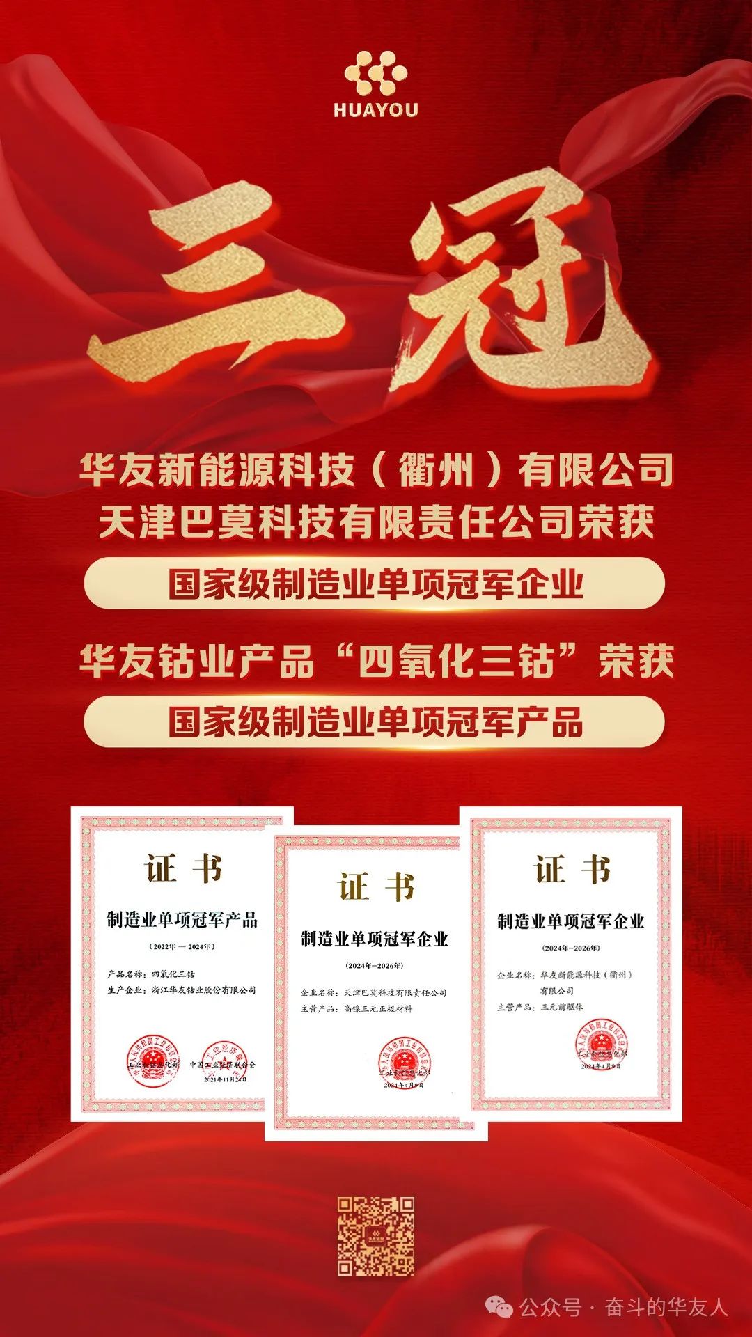 近日,華友鈷業(yè)旗下公司華友新能源科技(衢州)有限公司、天津巴莫科技有限責(zé)任公司雙雙獲得工信部正式頒發(fā)的“制造業(yè)單項(xiàng)冠軍qm球盟會(huì)·(中國(guó))球盟會(huì)”證書。此前,華友鈷業(yè)的“四氧化三鈷”已摘得“制造業(yè)單項(xiàng)冠軍產(chǎn)品”桂冠。