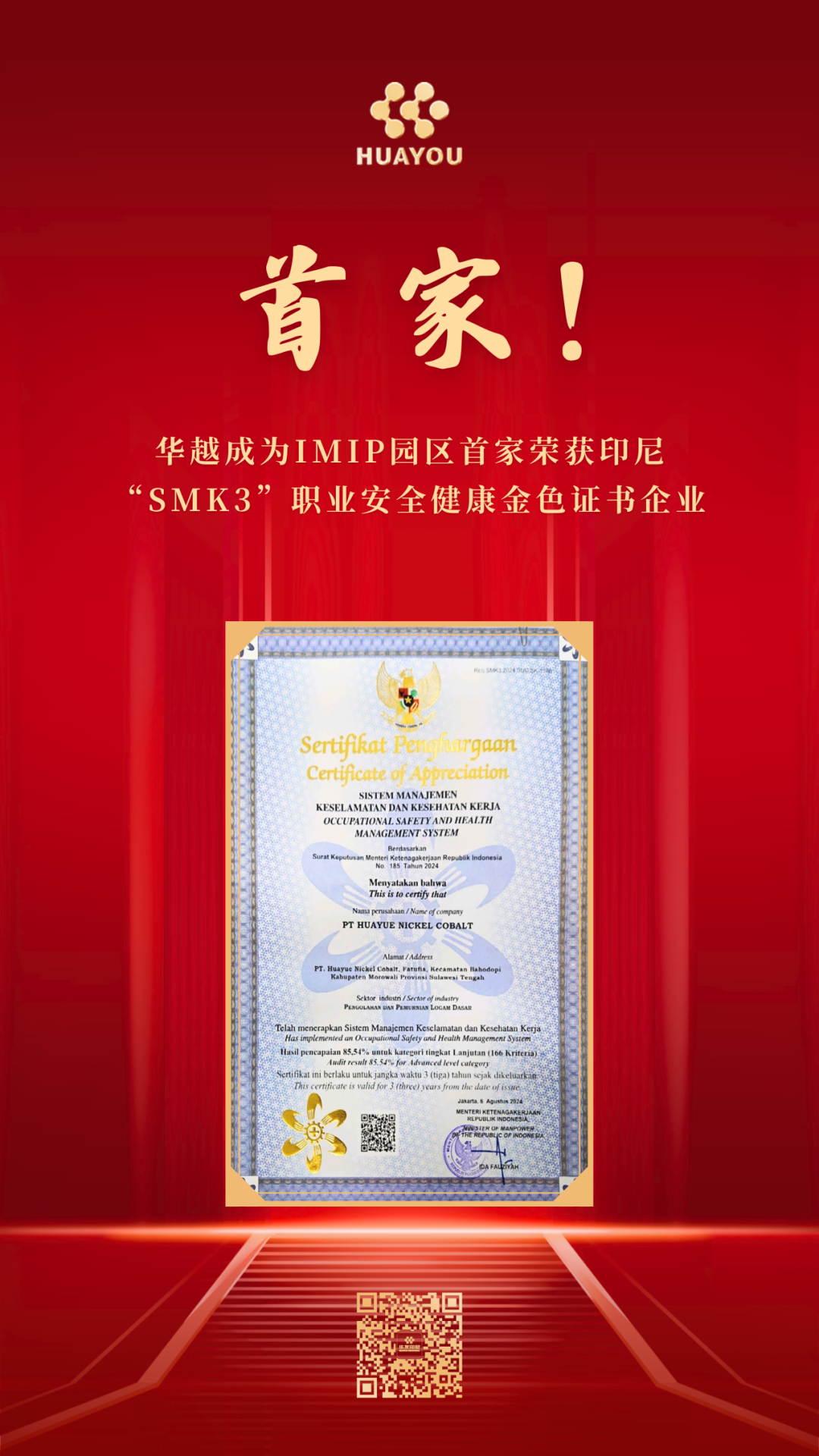 華越通過(guò)SMK3審核、并獲得最高等級(jí)金色證書認(rèn)證,標(biāo)志著公司在職業(yè)安全與健康管理方面獲得印尼勞工部最高等級(jí)認(rèn)可!也是華友印尼在落實(shí)qm球盟會(huì)·(中國(guó))球盟會(huì)安全生產(chǎn)主體責(zé)任、有效降低qm球盟會(huì)·(中國(guó))球盟會(huì)事故風(fēng)險(xiǎn)、保障職業(yè)安全健康方面取得了卓越的管理成就的體現(xiàn),為每一位員工提供安全健康的生活工作環(huán)境,為公司的高速發(fā)展保駕護(hù)航。