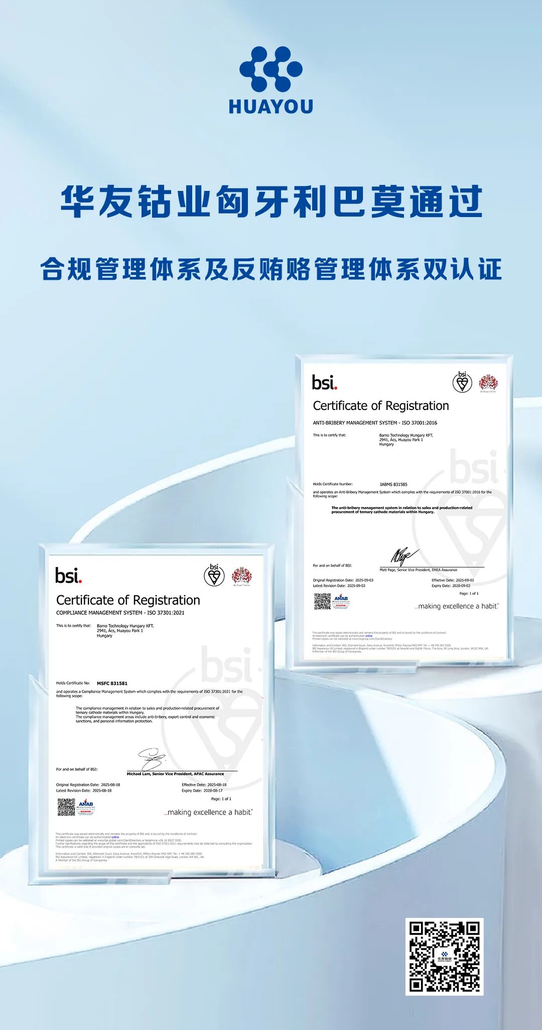 9月15日,華友鈷業(yè)旗下巴莫科技(匈牙利)有限公司(以下簡稱“匈牙利巴莫”)合規(guī)管理體系及反賄賂管理體系認(rèn)證頒證儀式舉行,標(biāo)志著匈牙利巴莫成為匈牙利首家通過ISO 37301合規(guī)管理體系及ISO 37001反賄賂管理體系雙認(rèn)證的中資qm球盟會·(中國)球盟會,彰顯了華友在新能源鋰電材料領(lǐng)域的合規(guī)管理領(lǐng)先地位。