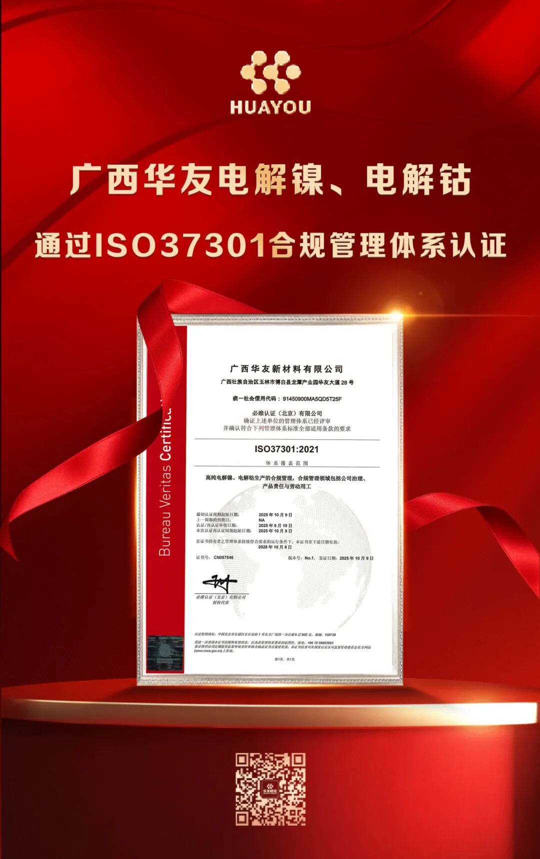 近日,華友鈷業(yè)旗下廣西華友新材料有限公司正式獲得國際權(quán)威認(rèn)證機構(gòu)頒發(fā)的ISO 37301合規(guī)管理體系認(rèn)證證書,為華友國際化戰(zhàn)略奠定了堅實的合規(guī)基礎(chǔ)。